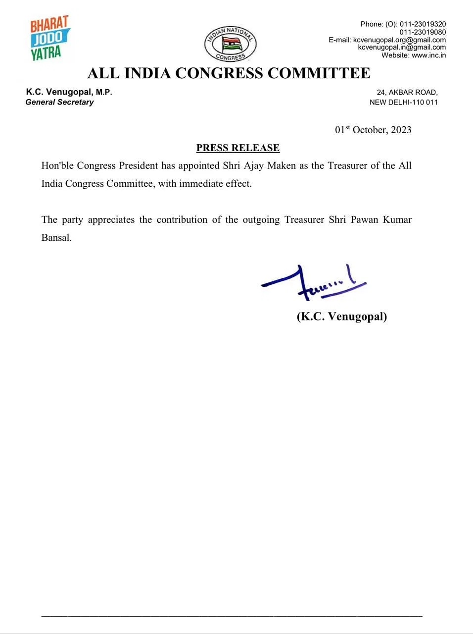 Congress general secretary KC Venugopal said in a statement that the party president has appointed Ajay Maken as treasurer of the All India Congress Committee (AICC) with immediate effect. It was also said that the party appreciates the contribution of outgoing treasurer Pawan Kumar Bansal. Bansal was appointed interim treasurer after the demise of Ahmed Patel.